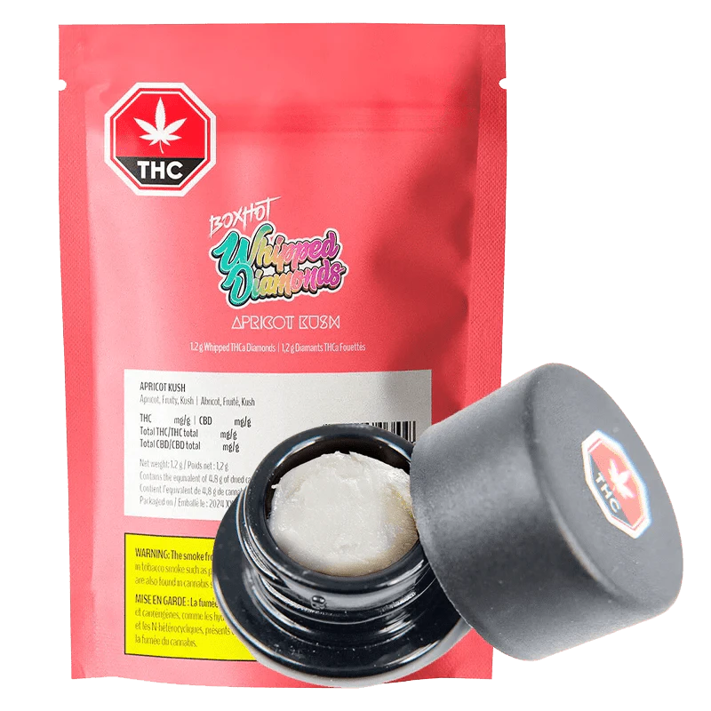 Blast to the future with BOXHOT Apricot Kush Whipped Diamonds, an iconic chart-topper that keeps it fresh -n' fly with rich apricot, a touch of tang, and earthy Kush. Super pure sativa THCa diamonds are converted to a butter-smooth consistency and boosted with botanical terps to deliver a one-two hit of flavour and potency. Add this next-gen heavy hitter to a dab rig and crystal whip them taste buds.