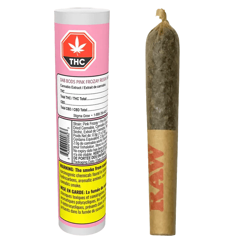 Dab Bods Resin Infused 0.5G Pre-Roll features the ideal strain to cheers to, Pink Frozay. This strain follows the lineage of Rozay and Bacio Gelato. This new pre-roll is in a 0.5G so you can enjoy it solo or with friends. Alluding to sour citrusy overtones followed by sweet fruit and spicy undertones this resin infused pre-roll gives you everything you could possibly ask for a summer party.