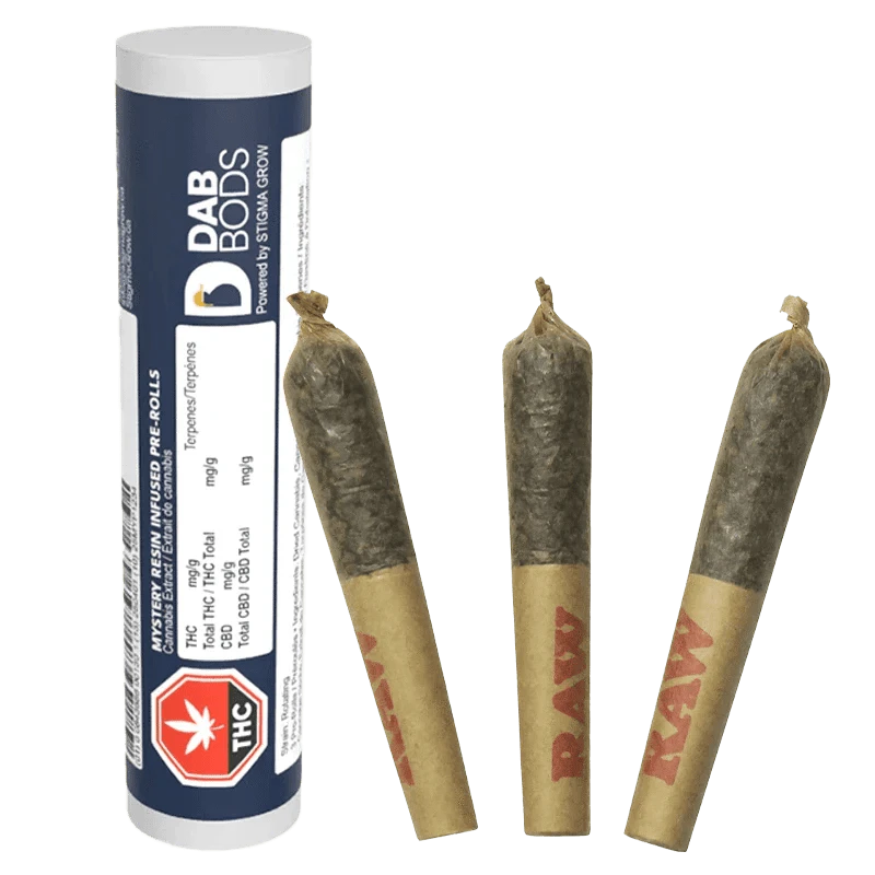Unveil the unknown with Dab Bods Mystery Resin Infused Pre-Rolls. Each pack contains three (same strain) 0.5g pre-rolls, carefully crafted with high-quality cannabis and infused with potent resin to deliver an exceptional, elevated experience. The mystery strain rotates with each lot packaged and adds an element of surprise to your smoke session, offering a unique blend of effects and flavors that are different every time you light up. Infused with rich cannabis terpenes and designed for a smooth, flavorful smoke, these pre-rolls promise a one-of-a-kind experience with every puff. Perfect for those who love a little unpredictability, these resin-infused pre-rolls are ideal for adventurous smokers looking for something new and exciting in every session.