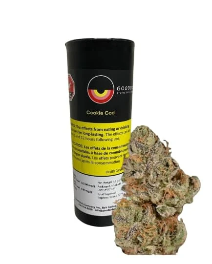 Cookie God is a delicious peanut cookie creation. It's a house-bred cross of the popular cookies strain Do-si-dos with GOOD BUDS' unique Salty God pheno of the BC Legacy strain God Bud. It boasts a mouthwatering peanut butter cookie flavour, combined with a sweet tropical fruitiness. A zippy sativa, Cookie God has uplifting and energetic vibes. Grown indoors in small batches, Cookie God thrives in a nurturing environment, with each batch hand harvested, hang dried, and slow cured using artisanal methods to ensure top quality. Conveniently packaged as 0.5g pre-rolls in unbleached organic cones, they are hand-finished and hand-packed into Ecolite Dube Tubes for optimal freshness and potency.