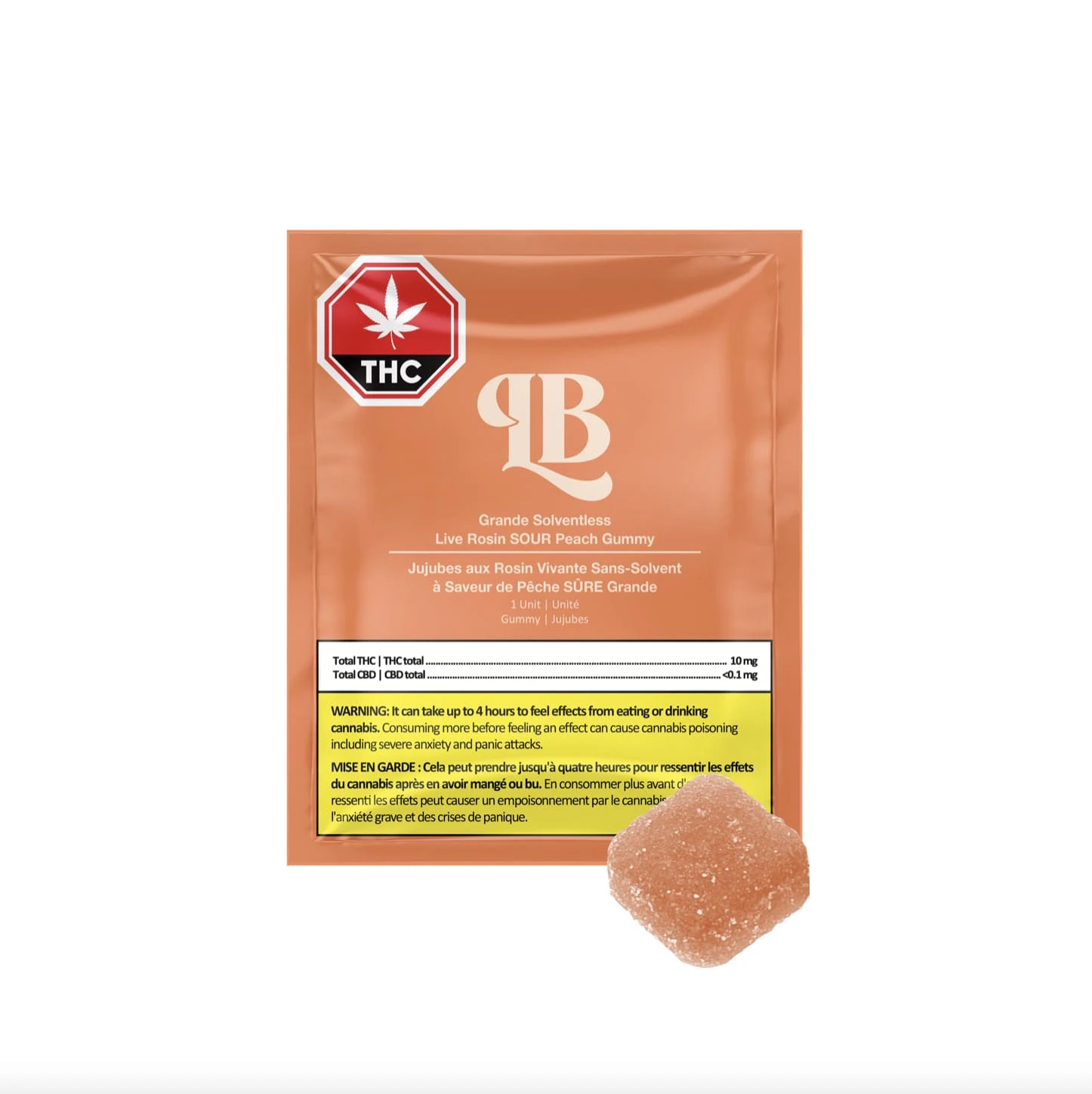 La Boca's classic Sour Peach Solventless Live Rosin gummy in a Grande 1 x 10mg dosage.