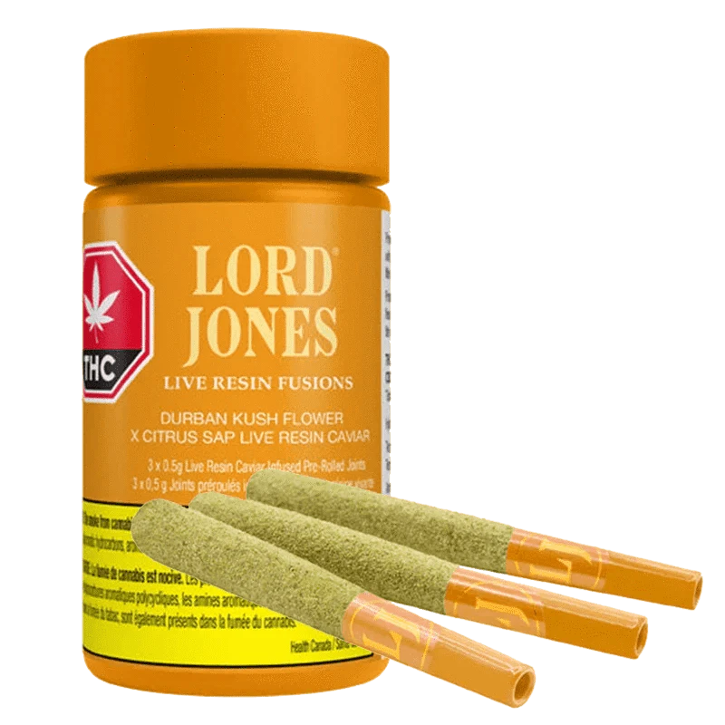With the Lord Jones Live Resin Fusions Durban Kush x Citrus Sap, take your tastebuds through an orchard of citrus and cedar flavours from the combination of tangy Citrus Sap live resin and Durban Kush flower. Together, these strains create a live resin caviar infused pre-roll like no other.