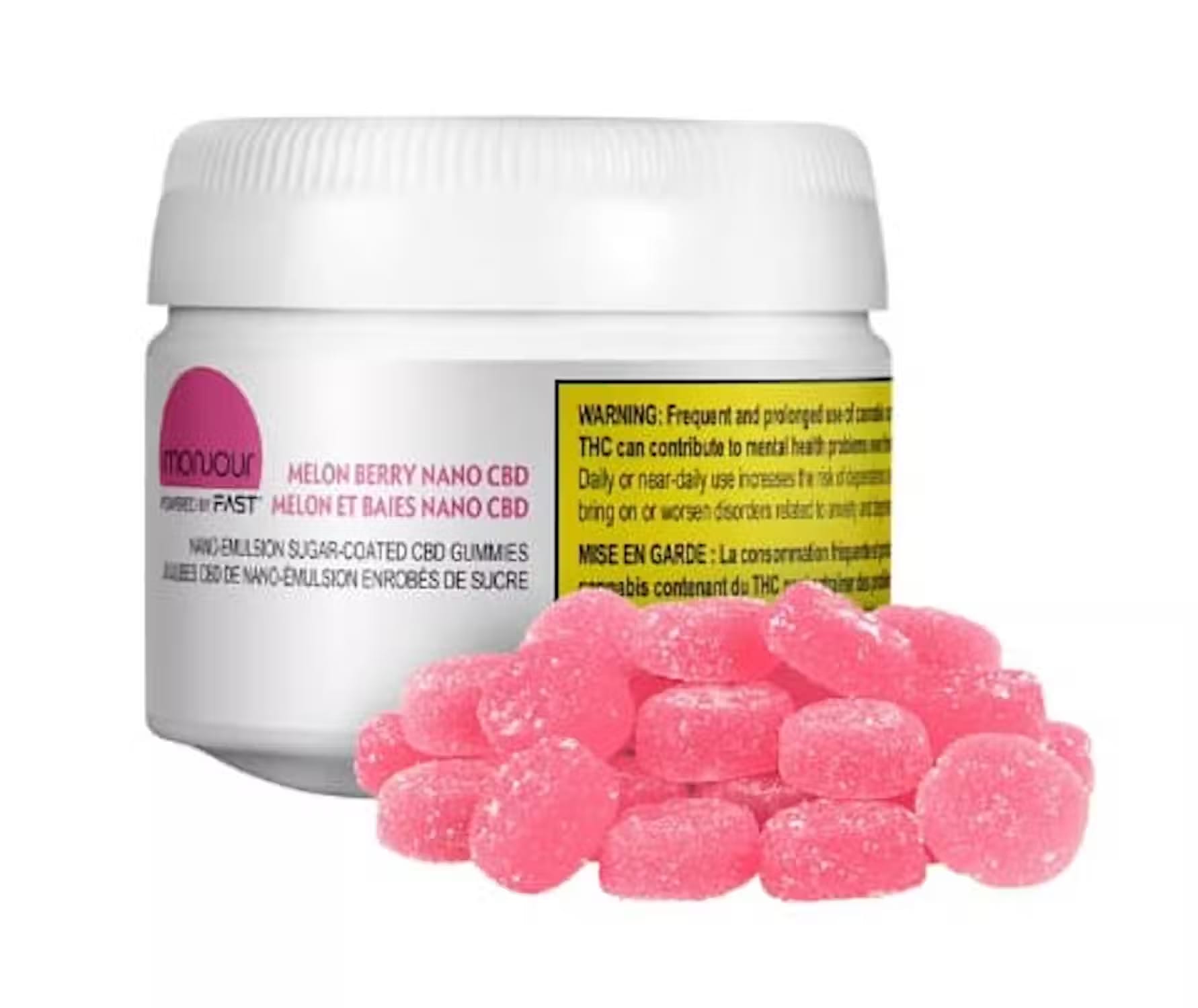 Monjour Melon Berry Nano CBD gummies offer a jolt of CBD powered by FASTTM, our Fast Acting Soluble Technology. Each gummy contains 20 mg of CBD, with peak CBD levels nearly 2 times higher and delivered 50% faster. Experience the sweet, berry-flavour in every bite. Peak CBD levels that are 80% higher and are delivered 50% faster than identical gummy without nano-emulsion according to a clinical study. Individual results may vary.