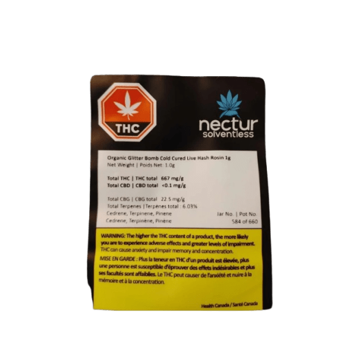 Glitter Bomb Cold Cured Live Bubble Hash Rosin is a premium solventless concentrate made from organically grown, small-batch Glitter Bomb flower. This indica-dominant hybrid is renowned for its exceptional trichome coverage and intricate aroma profile, combining sweet fruit, mild perfume, candy, grapes, and gassy notes.