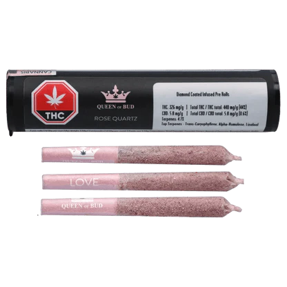 Our new Rose Quartz Strawberry Lemonade pre-rolls are where the essence of universal love meets the perfect high. Rose Quartz, renowned for its ability to enhance comfort in social settings, uplift the spirit, and foster deep connections, is now embodied in our premium high-THC cultivar. Infused with 100% plant-derived botanical terpenes, this exquisite pre-roll delivers an enchanting aroma of sweet Strawberry Basil Lemonade. Inhale love, exhale doubt-it's time to fall in love with life all over again.
