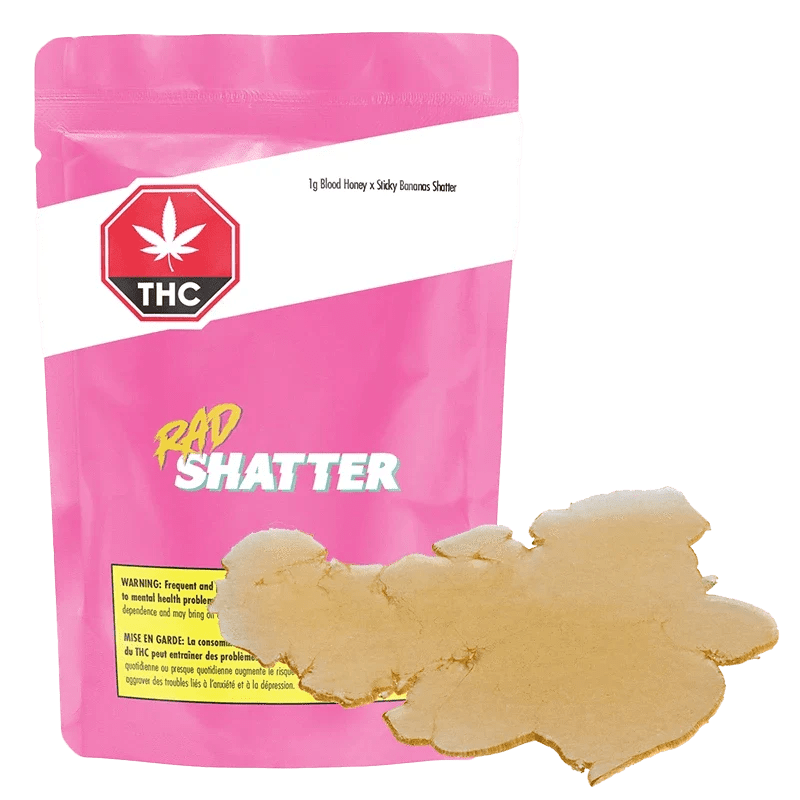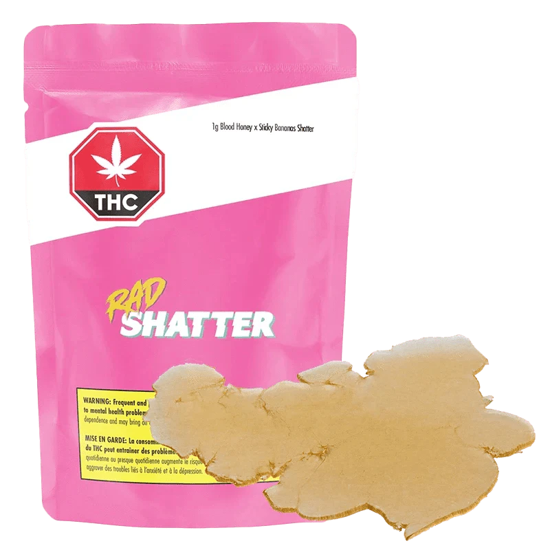 Dive into a euphoric balance of potency and deliciousness with RAD Sticky Bananas x Blood Honey Shatter. An instant classic concentrate boasting tropical and sweet flavour profiles, extracted via hydrocarbon extraction for a potent, solid shatter and a perfect balance of high THC and a great taste. Made using only fresh-frozen flower, this full-spectrum extract is great for dabbing on its own or adding a boost of potency to your pre-rolls.