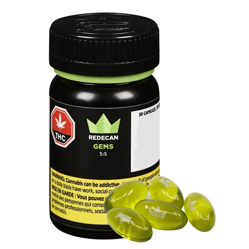 Redecan 5:5 Softgels from the Niagara region in Ontario are made from oils that are CO2-extracted from a blend of Redecan's greenhouse-grown cannabis. Each of the 15 Softgels per bottle contains 5 mg of THC and 5 mg of CBD.