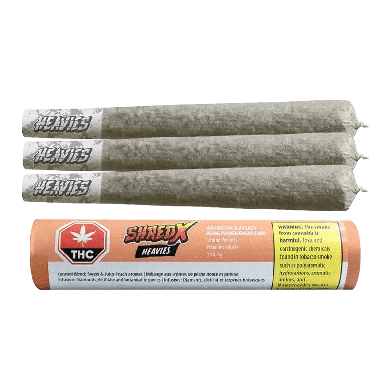 Mother Pucker Peach is joining the SHRED X Heavies lineup, and it does not do so quietly. These Diamonds, Disty & Terp infused pre-rolls have a LOUD mouth-watering peachy aroma profile (like, so much peach) thanks to a botanical terp injection, and an even LOUDER 40%+ THC headline. As a reminder to all our SHRED Heads, our SHRED X Heavies are Not For Lightweights! 3 x 0.5g infused pre-rolls in one doob tube for a convenient and ultra potent sesh. Pucker up peach fans, this ones a doozie!