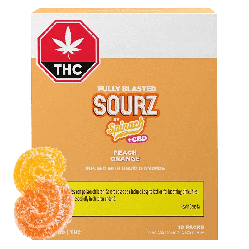 This multipack contains 10 immediate containers, each with one soft chew-for a total of 10 soft chews. Prepare for blast off! SOURZ by Spinach Fully Blasted Peach Orange 1:1 CBD | THC gummies are action-packed with a balanced blend of 10mg THC and 10mg CBD per piece. Glide through the galaxy with sweet peach and juicy orange flavours These dual-flavoured gummies are over-the-top with natural flavours and blasted with sour crystals. Enjoy 10 gummies with 10mg THC and 10mg CBD per gummy, 100mg THC total and 100mg CBD total per pack.