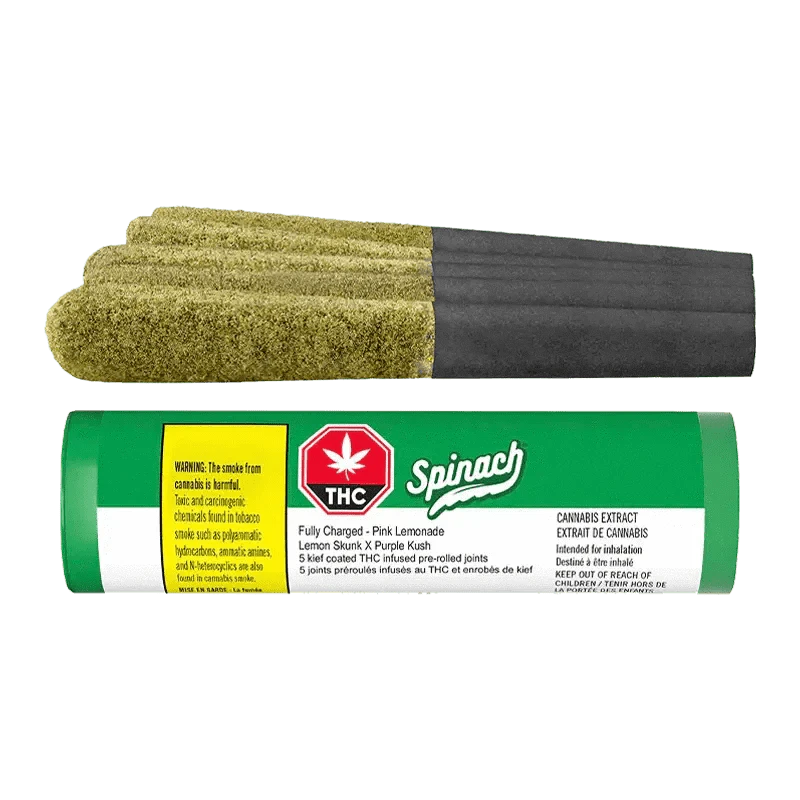 Get that summertime, thirst-quenching experience in one delicious infused pre-roll. It's a summer that never ends with our Spinach Fully Charged Pink Lemonade infused pre-roll and we're not sorry about it. Infused with the finest, cold-filtered cannabis extract, we've leveled up our potency to sunshine level strength at 35%+ THC. With a Lemon Skunk and Purple Kush lineage and our dialed-up terpene infusion, these sweet, raspberry and refreshing lemonade flavour notes are like a fresh summer breeze on your face. Spinach Fully Charged Pink Lemonade infused pre-rolls will have you ready for any park hang or patio lounge with friends.